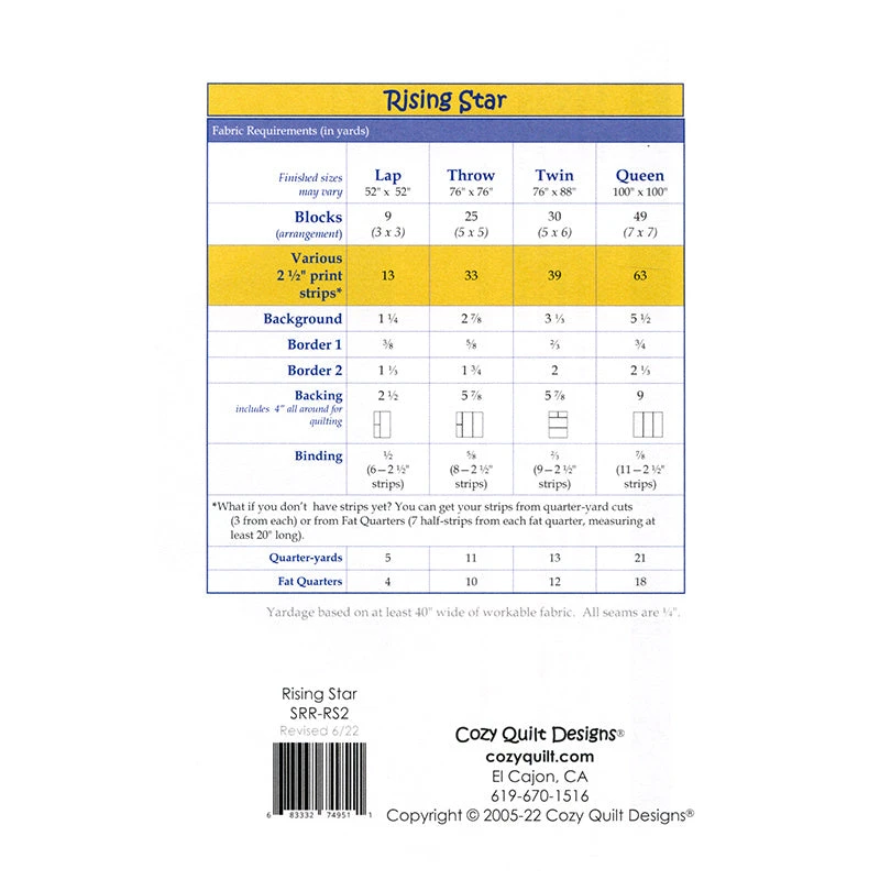 Everyone loves stars, and this new technique will ensure that you achieve fabulous, sharp points every time! The Rising Star Quilt Pattern from Cozy Quilt Designs uses 2 1/2” strips in a rainbow of colors. From patriotic prints to bright batiks or muted shades, these stars pop in every color! Full-color instructions available for four sizes!