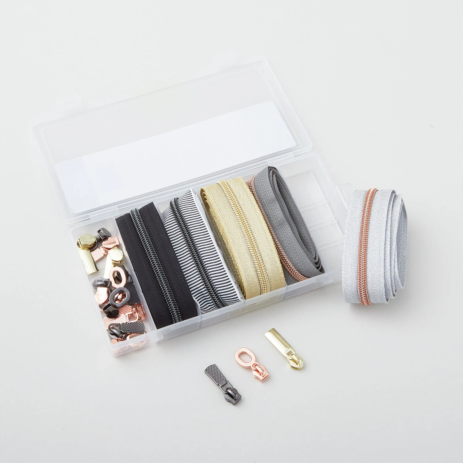 This fun zipper bundle from Sallie Tomato is great to have on hand when you need a zipper with cosmic flair! Zipper bundle includes five 1-yard lengths of #5 zipper tape and 15 zipper pulls: three rose gold oval, three rose gold texture, three gunmetal oval, three gunmetal texture, and three gold rectangle. You can easily cut and sew through the nylon teeth to get the length you need!