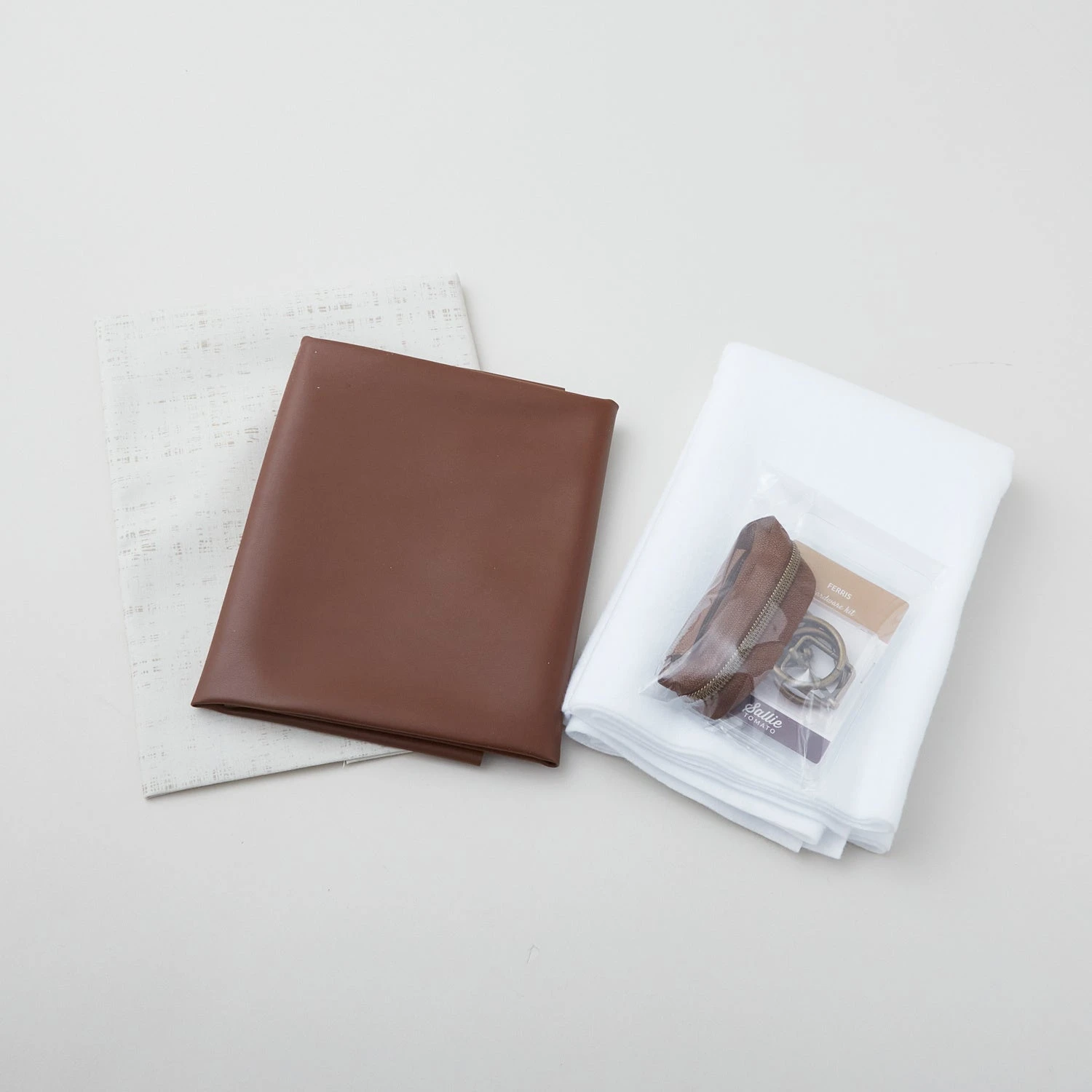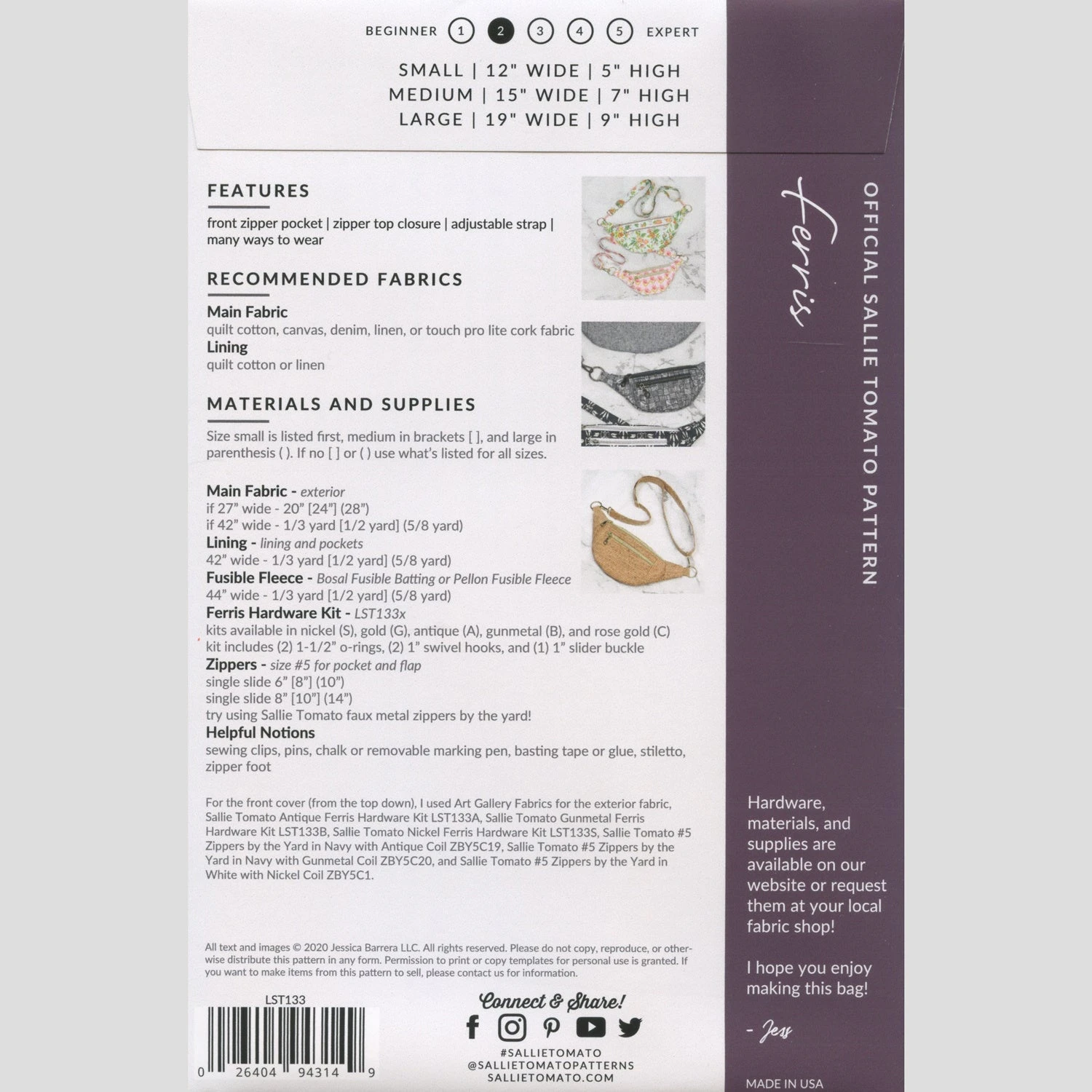 Fanny packs are back in style! Join the trend by sewing your own Ferris Fanny Pack by Sallie Tomato. This fully-lined, functional fanny pack features a zipper pocket, zipper bag closure, and an adjustable strap. Pattern comes with step-by-step directions for all three sizes. Kit includes pattern, brown faux leather, main fabric, lining, fusible fleece and a antique zipper and two zipper pulls. Note: Kit will only make the small or medium size fanny pack.