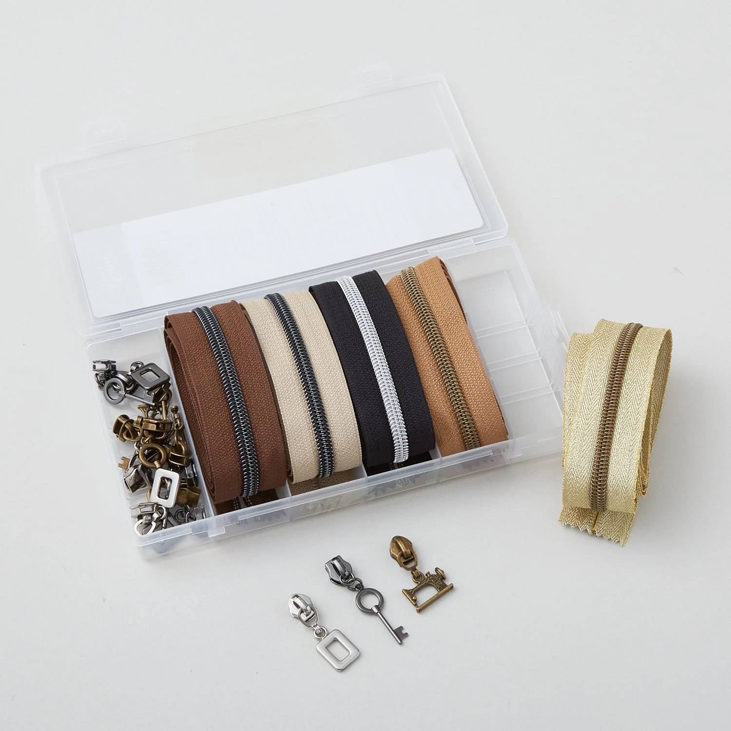 This fun zipper bundle from Sallie Tomato is great to have on hand when you need a zipper with a vintage modern flair! Zipper bundle includes five 1-yard lengths of #5 zipper tape and 15 zipper pulls: three gunmetal keys, three gunmetal rounded rectangles, three nickel rounded rectangles, three antique keys, and three antique sewing machines. You can easily cut and sew through the nylon teeth to get the length you need!