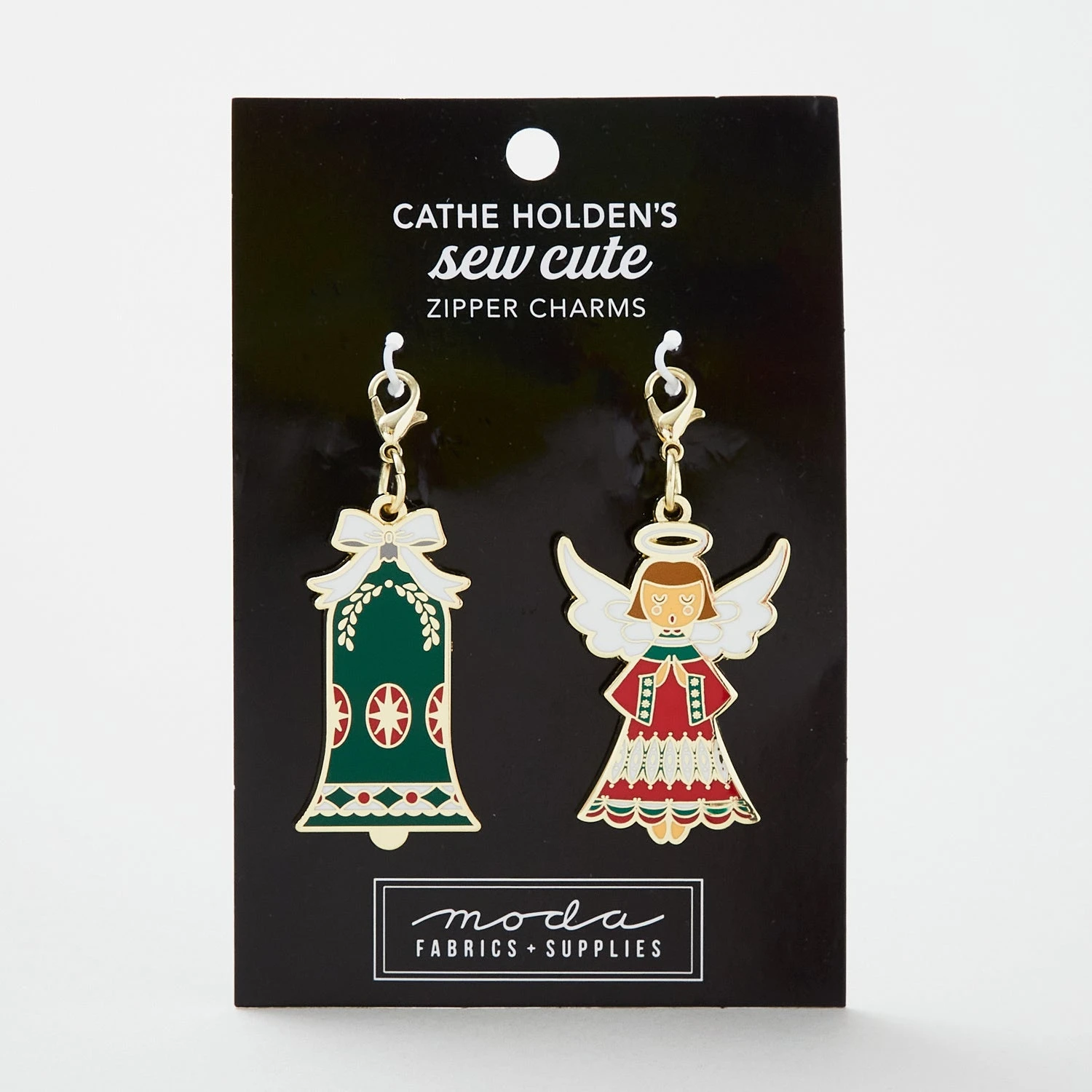 Decorate your apparel or bags with these holiday enamel zipper charms from Moda. The set includes two charms: a festive bell and an angel The charms have lobster claw hooks that allow you to easily attach them to any zipper that has an opening in the pull tab.