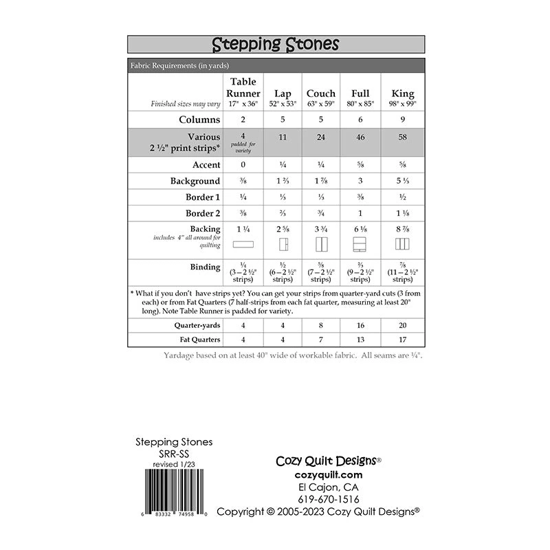 If you love the Cozy Strip Club pattern, then you’ll love this revised and updated version. This fabulous vertical quilt may look complicated, but with some Seminole strip-piecing, it’s a breeze! Use soft romantic colors for a quilt that looks like an old favorite, jazz it up with 30 prints, or create a classic masterpiece with warm brown country colors, the choices are endless. This pattern includes full-color instructions in 5 different sizes.