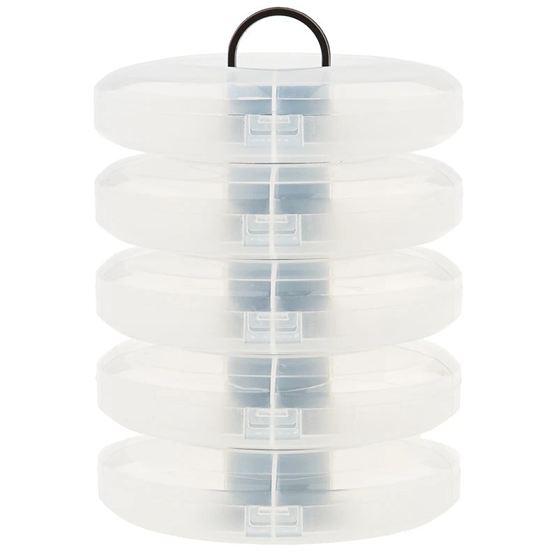Compact and convenient storage for quilting, sewing and craft supplies. Tower featured a center spindle with handle that holds five removable containers. Each translucent plastic container has a hinged lid with five divided compartments.