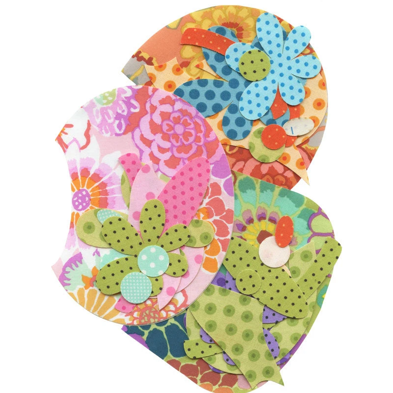 Laser cut iron-on appliqué shapes backed with Steam-A-Seam 2 fusible webbing.