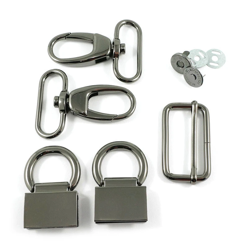 Got your eye on the Double Flip Bag Pattern from Emmaline Bags? This kit includes all the hardware you need to make that fabulous bag! From this kit, you receive one 9/26″ slim magnetic snap, two 1 1/2″ swivel snap hooks, one 1 1/2″ adjustable strap slider, and two edge connectors — all in a gunmetal finish.