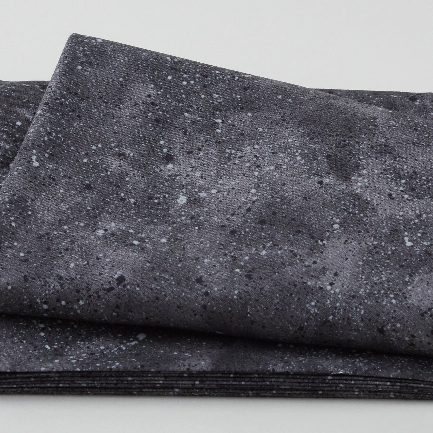 A 3-yard cut of gray, black and white spatters on a gray background. Embrace your inner artist with the Wilmington Essentials – Spatter collection! These prints, which mimic paint spattered on canvas, feature tonal specks on mottled backgrounds, making them great blenders.