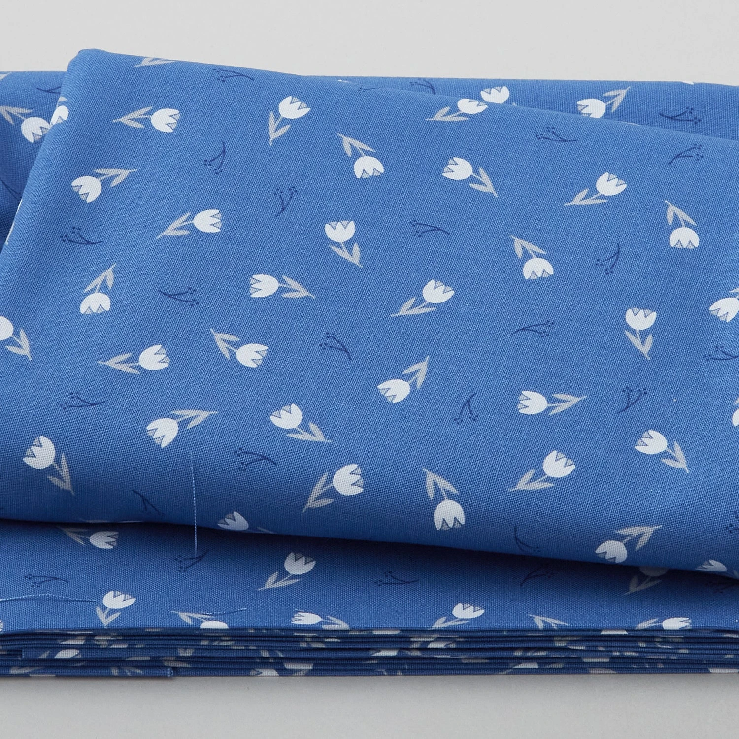 A 3-yard cut of white and gray tulips on a blue background. Pretty flowers and trees fill Windsong Meadows from Wilmington Prints. The blue, teal and gray prints come together to create a beautiful, cool color palette.